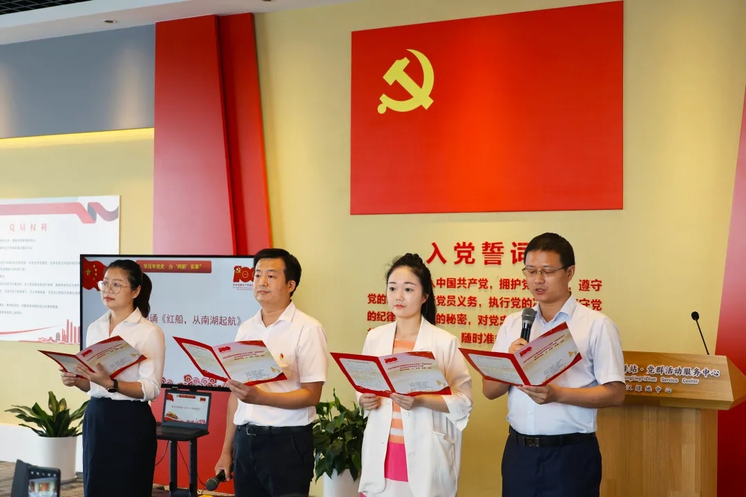 活动中全体成员重温入党誓词,认真聆听了由武汉中共中央机关旧址纪念馆副馆长、武汉市党史宣讲团成员周静讲授特色党课《办好中国的事情关键在党》,观看了区委组织部、区委宣传部指导拍摄的党史教育宣传片《珞珈红脉——周恩来在珞珈山》,区商务局、徐家棚街、中铁物贸、国能华中四名青年党会员代表朗诵红色诗歌《红船,从南湖起航》,全体党员合唱《没有共产党就没有新中国》,集体接受党史学习教育。