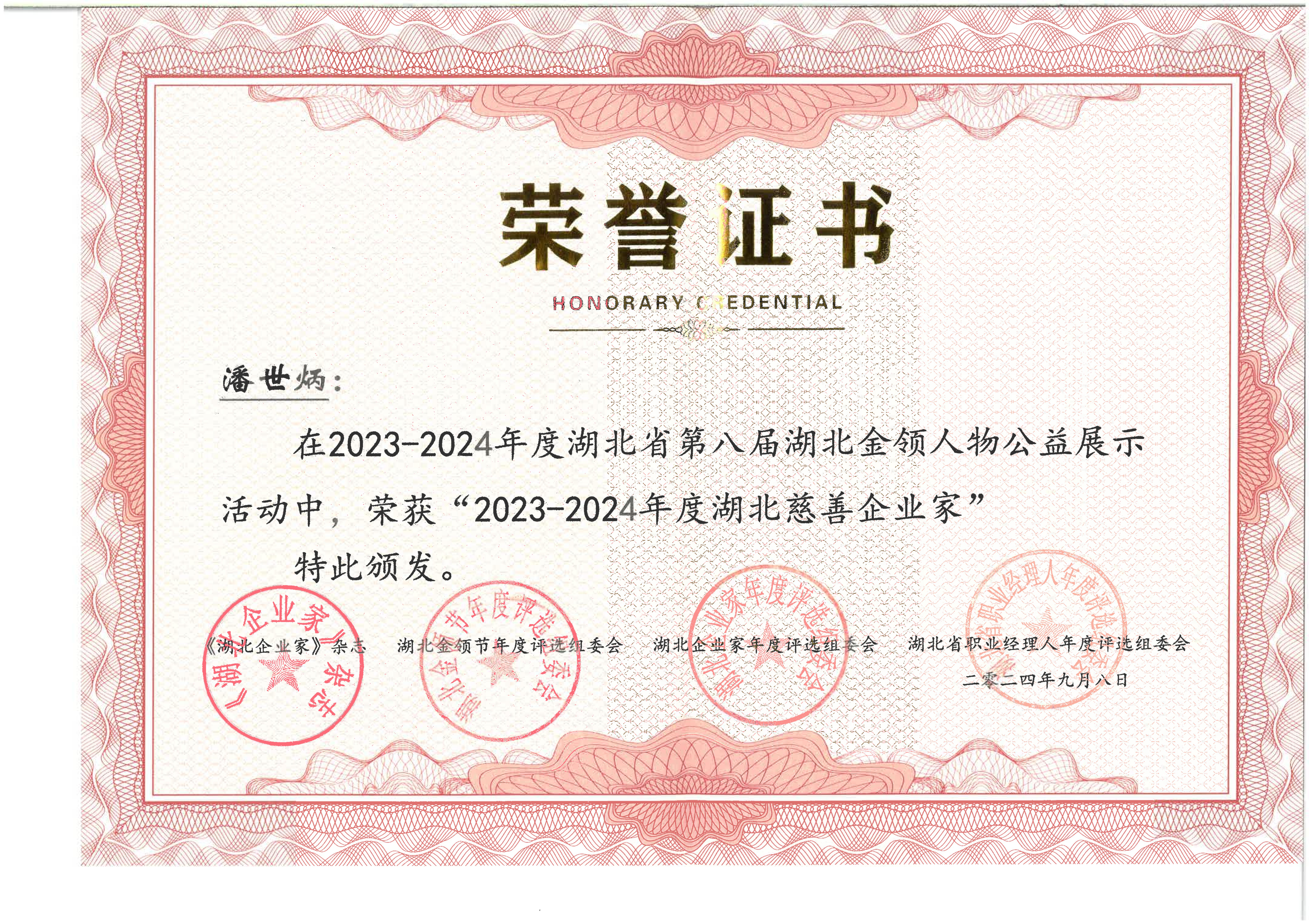 潘世炳荣获2023-2024年度湖北慈善企业家